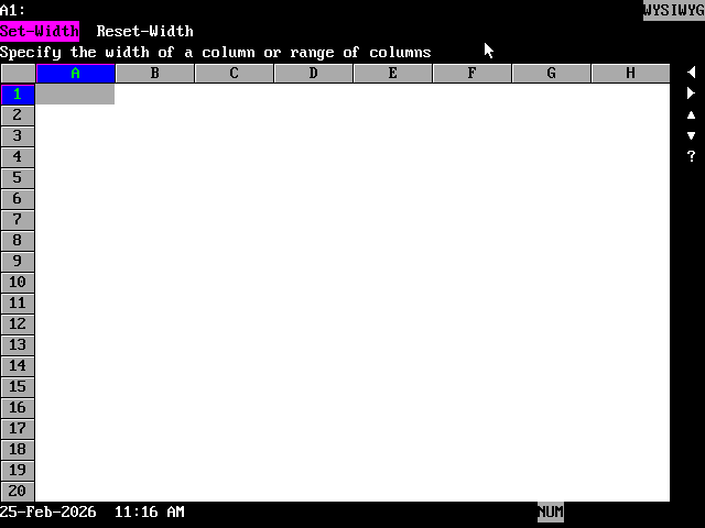 We gain a lot, but there is a notable absence: the upper-right status check. VisiCalc shows calculation order, arrow-key toggle, and free memory in that spot. Those are all gone in 1-2-3 and good riddance, frankly. On the PC I have full arrow keys and more RAM than Woz; 1-2-3 sees my full 16MB of DOS Extended memory. There is no stopping me.